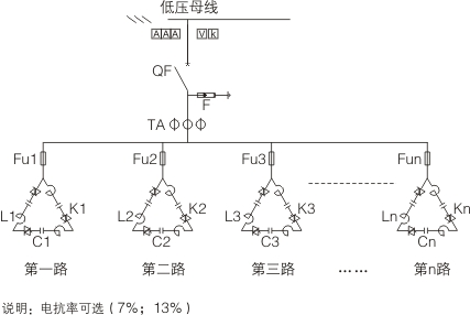 低壓TSC動態(tài)無功補償裝置采用人工智能控制,由控制器、雙向可控硅、電容器、電抗器、保護元件等組成??刂破鲗崟r跟蹤測量負荷的功率因數(shù)和無功電流,與預(yù)先設(shè)定的給定值進線比較,動態(tài)控制電容器組的投切,以保證功率因數(shù)達到設(shè)定值。整個測量執(zhí)行過程在一個周波內(nèi)完成(時間<20ms),并實現(xiàn)可控硅過零觸發(fā),確保投切電容器無沖擊、無涌流、無過渡過程